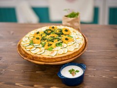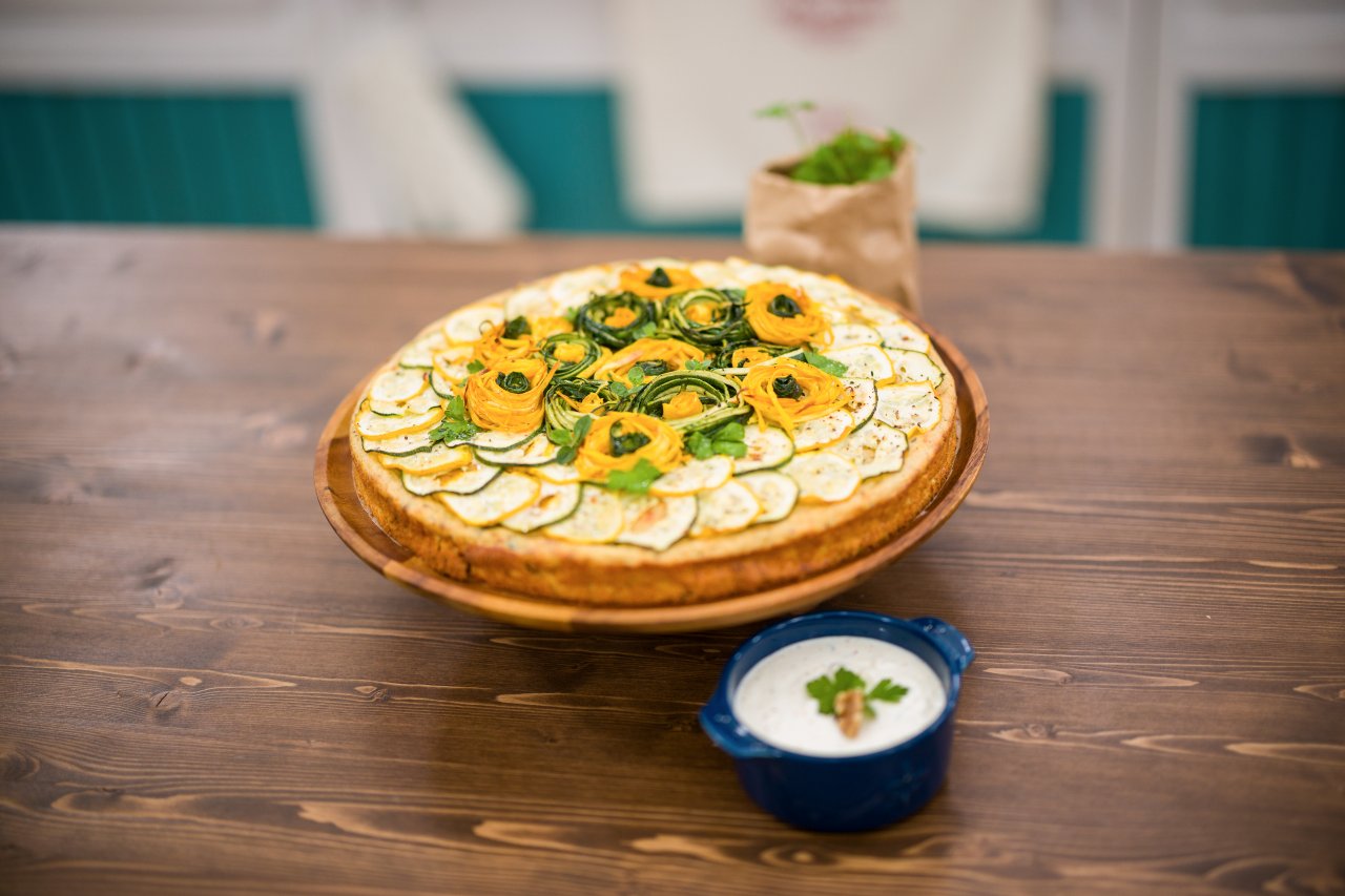 Kulatou formu o průměru 28 cm s odnímatelným dnem vystříkáme olejem, vlijeme těsto a necháme znovu kynout přímo ve formě. Pečeme v troubě předehřáté na 180 °C (horkovzduch) přibližně 25–30 minut. Ke konci pečení přidáme ozdoby z cukety a zapečeme dalších 5–10 minut.