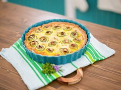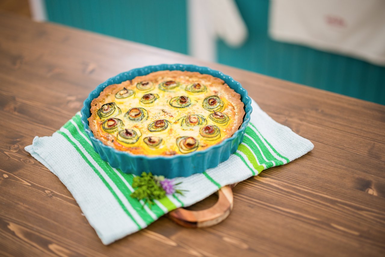 Předpečený korpus plníme od středu formy růžičkami z cukety. Mezi srolované cukety rovnoměrně rozložíme sýr se slaninou a vše zalijeme smetanovovaječnou směsí. Pečeme přibližně 30–35 minut v troubě předehřáté na 180 °C. Asi 10 minut před koncem pečení povrch posypeme strouhaným parmazánem.