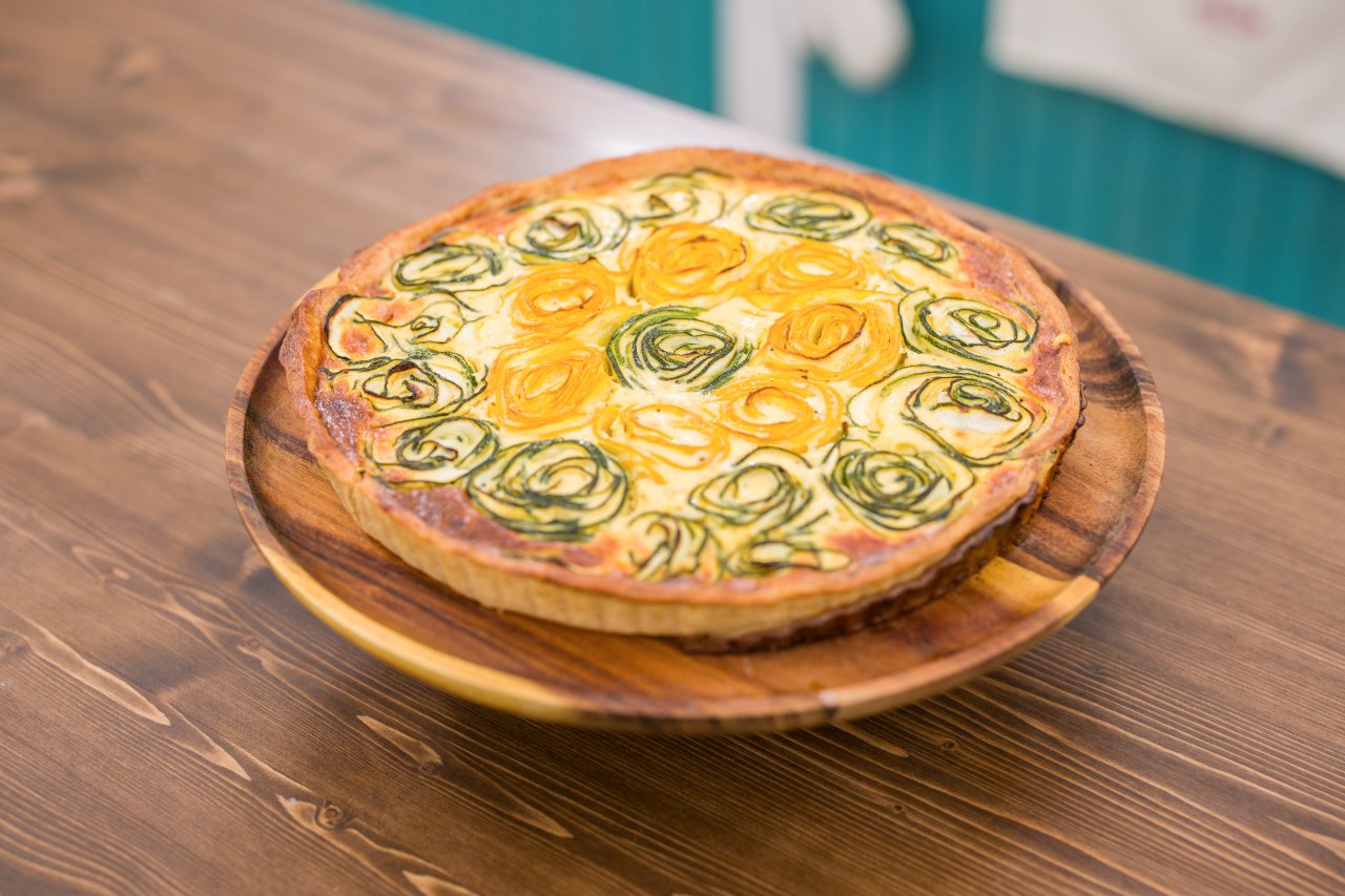 Vychladlý quiche vyjmeme z formy, položíme na lehce zmačkaný pečicí papír a podáváme společně s cuketovou limonádou.