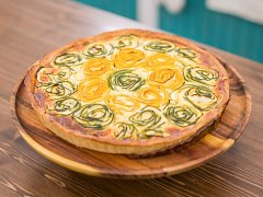 Do upečeného korpusu nalijeme náplň a povrch posypeme sýrem comté. Cuketovo-slaninové ruličky vyskládáme na quiche do tvaru květiny. Pečeme přibližně 45 minut při 160 °C ve spodní části trouby, aby se cuketa nepřepálila.