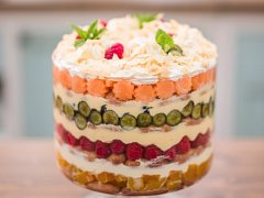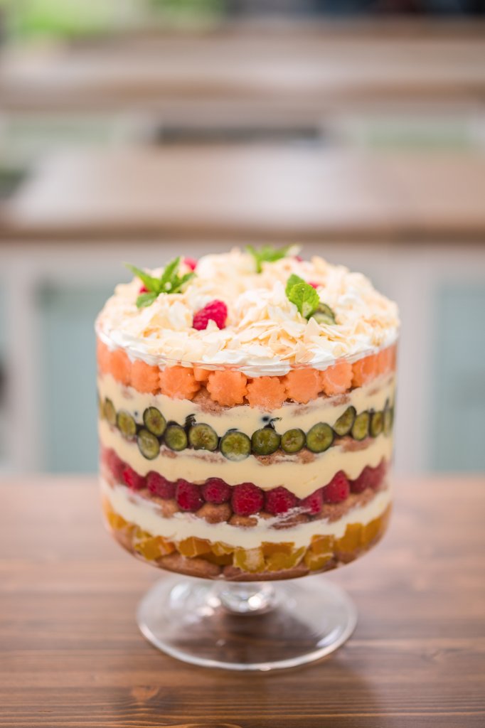 Do skleněné nádoby začneme vrstvit namočené piškoty v brandy, na ně rozložíme dýni, přidáme vrstvu šlehačky a další piškoty. Pokračujeme malinami, pudingem, piškoty, borůvkami, další vrstvou pudingu, piškoty a melounem. Povrch zakončíme šlehačkou s brandy, posypeme opečenými mandlovými lupínky a dozdobíme ovocem použitým uvnitř triflu. Zbytky ovoce z vykrajování rozmixujeme a podle potřeby jimi přelijeme jednotlivé ovocné vrstvy.