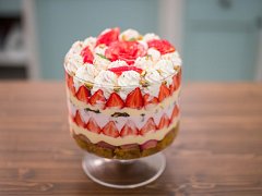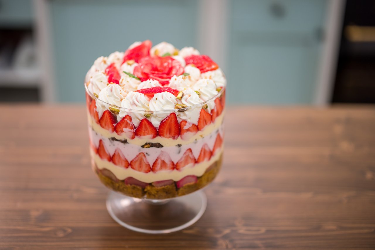 Dýňový korpus nakrájíme na stejně velké kostky a nasypeme na dno mísy na trifle, lehce pokapeme griotkou. Přidáme vrstvu rebarborového kompotu a na něj rovnoměrně rozetřeme vanilkový krém. Na krém naskládáme jahody řezem ven po obvodu mísy i do středu, lehce je zakápneme griotkou a překryjeme jahodovou mousse. Povrch posypeme karamelizovanými pistáciemi, ozdobně nastříkáme šlehačku a dozdobíme čerstvými jahodami a nasekanými pistáciemi.