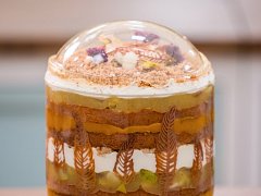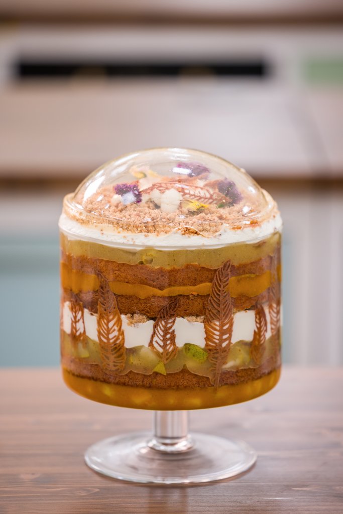 Korpus rozřízneme na dva pláty vysoké přibližně 1 cm a lehce prolijeme mlékem. Do mísy vrstvíme batátovojablečné compoté, korpus, hruškové compoté, korpus, šlehanou ganáž, karamel a crumble. Vrstvy jednou zopakujeme. Povrch zasypeme crumblem, dozdobíme jedlými květy, opraženými pekanovými ořechy, zbytkem krémů a skořicovým tuile. Nakonec zakryjeme cukrovou kopulí.