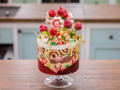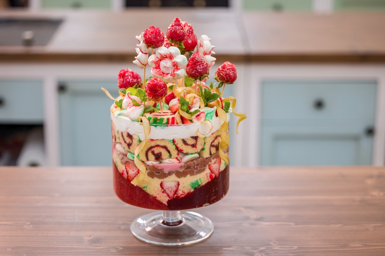 Dno i obvod mísy na trifle vyložíme plátky rolády. Navrstvíme polovinu vanilkového krému, polovinu ovocné náplně a polovinu vanilkové šlehačky. Stejný postup zopakujeme ještě jednou. Povrch ozdobíme plátky rolády, čerstvými jahodami, šlehačkou, sněhovými pusinkami a lístky máty. Nakonec dozdobíme rebarborovými stuhami a zapíchneme jahodové růže.