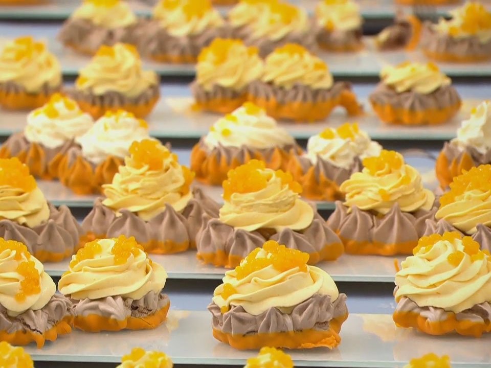 Dýňové želé se smetanou společně vyšleháme do hladkého krému. Pomocí cukrářského sáčku se zdobicí špičkou Wilton 1M nastříkáme na ježky ve tvaru kopečku připomínajícího zmrzlinu. Dozdobíme pomerančovým kaviárem, přibližně jednou lžičkou kuliček na kus.