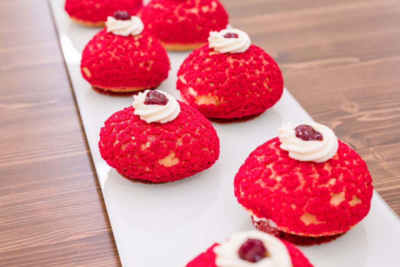 Z upečených choux s křupavou vrstvou opatrně vykrojíme dno a odložíme stranou. Z red velvet korpusu vykrojíme kolečka o průměru 5 cm. Choux otočíme otvorem vzhůru, naplníme malým množstvím krému a vložíme višňové compoté. Poté doplníme krém přibližně do dvou třetin, vložíme kolečko red velvet korpusu a lehce přitlačíme, aby v dezertu nezůstala vzduchová bublina. Na korpus naneseme malé množství krému a přiklopíme spodní částí choux. Vršek ozdobíme krémem, čerstvou višní a zlatým prachem.
