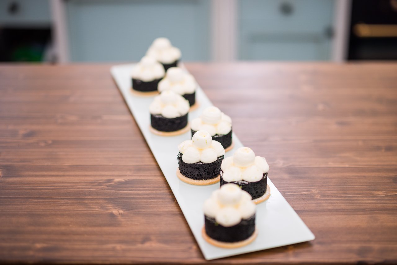Upečené korpusy vyjmeme z formy a zařízneme na výšku 3 cm a položíme na mandlové sablé. Zdobíme šlehanou limetkovou ganáží a limetkovým gelem. Limetkové želé dáme na ganáž a na želé dáme opět limetkovou ganáž. Na závěr posypeme zlatými třpytkami a dozdobíme jemně nastrouhanou limetkovou kůrou.