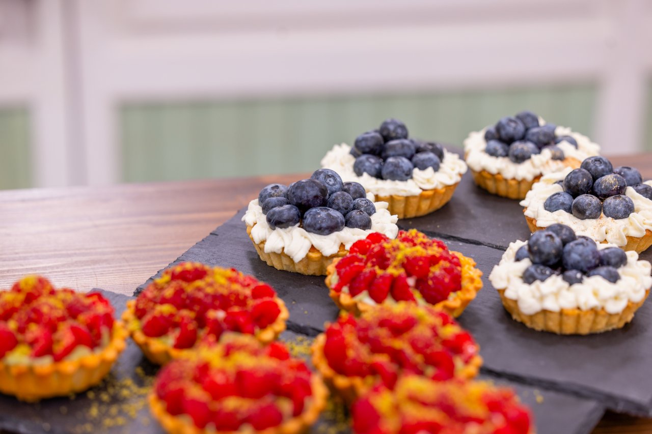 Mouku se solí nasypeme do mísy robota, přidáme na kostičky nakrájené studené máslo a při nízké rychlosti vytvoříme drobenku. Přisypeme moučkového cukru, přidáme vejce a krátce vypracujeme kompaktní těsto. Těsto zabalíme do fólie a uložíme do lednice alespoň na hodinu. Vychlazené těsto rozválíme mezi dvěma archy pečicího papíru a vyložíme jím formičky na tartaletky o průměru 9 cm. Připravené tartaletky vložíme krátce do mrazáku, aby byly dokonale vychlazené. Poté je naplníme bezinkovým crème pâtissière, na krém rozložíme čerstvé borůvky a pečeme při 170 °C horkovzduch přibližně 20 minut.