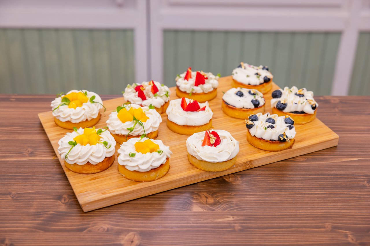 Namražené tartaletky v ráfcích pečeme při 170 °C přibližně 10 minut. Vyjmeme z ráfků, potřeme směsí žloutků a smetany a naplníme jednotlivými frangipane náplněmi. Do citronového frangipane vložíme několik borůvek, do mandlového kousky jahod a rebarbory, do kokosového kostičky manga. Pečeme při 160 °C dalších 8–10 minut dozlatova. Po vychladnutí plníme odpovídajícími compoté a necháme ztuhnout. Ovoce glazujeme. Jahodové a borůvkové tartaletky zdobíme vanilkovou chantilly, mangové kokosovou chantilly. Dokončíme ovocem, microgreens, zlatou barvou a plátky zlata.