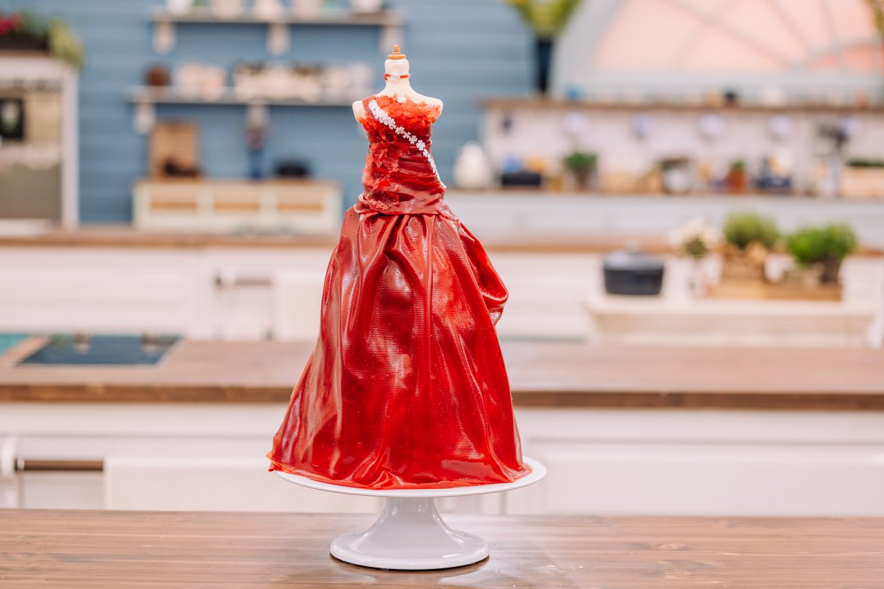 Všechny korpusy jednou prořízneme, pokropíme imbibage a potřeme částí krému. Na krém položíme větší vklad z granátového jablka, znovu potřeme krémem a zaklopíme korpusem. Povrch opět zvlhčíme imbibage, naneseme tenkou vrstvu krému, posypeme crunchem a zarovnáme krémem. Postupujeme od největších korpusů o průměru 20 cm, pokračujeme korpusy o průměru 18 cm a zakončíme kuželovitým korpusem. Dort seřízneme do požadovaného tvaru a obmažeme tenkou vrstvou máslovokondenzovaného krému, aby držel tvar. Necháme zatuhnout v lednici. Z modelovací hmoty vytvarujeme tělo a na vychlazený dort postupně aplikujeme jedlé látky z čokolády a papíru. Pomocí potravinářského lepidla dozdobíme cukrovými perlami a červeným dekoračním cukrem.