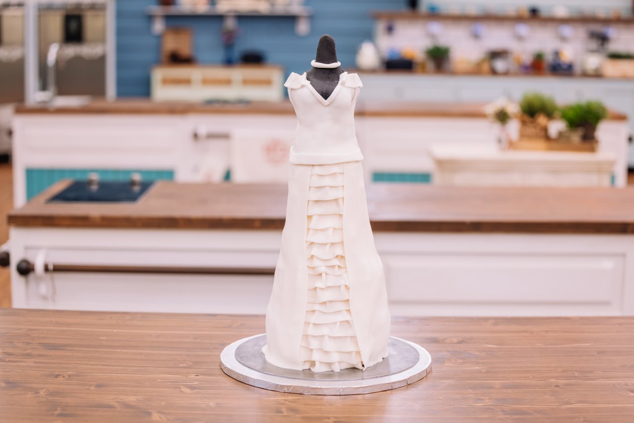 Všechny korpusy rozřízneme na pláty. Na konstrukci se středovou tyčí postupně vrstvíme jednotlivé korpusy, které promazáváme višňovým švýcarským máslovým krémem a prokládáme višňovým želé. Dbáme na rovnoměrné rozložení vrstev. Celý dort obmažeme tenkou vrstvou krému, uhladíme a necháme vychladit. Poté vyřežeme tvar šatů s vrškem krejčovské panny a celý dort potáhneme ganáží. Potahovací hmotu rozdělíme na tři části, dvě obarvíme na černo, jednu na žluto a jednu ponecháme bílou. Pomocí strojku na těstoviny vyválíme tenké pláty a od spodních volánů postupně modelujeme vrstvy šatů směrem vzhůru, včetně korzetu a zdobných detailů. Na závěr dort jemně poprášíme zlatou prachovou barvou.