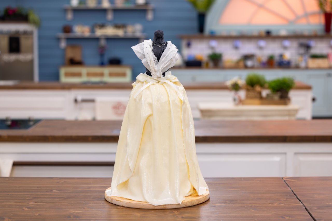 Každý korpus rozřízneme na tři pláty a pomocí dávkovače je prokapeme likérem Malibu. Dorty vrstvíme krémem, křupavou vrstvou, crémeux a compoté. Povrch obmažeme ruským máslovým krémem. Po ztuhnutí zapíchneme do středu výztuž a nasadíme vytvarované tělo panny. Dort finálně dekorujeme připravenými prvky.