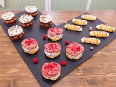 Z korpusu vykrajujeme oválné tvary a vodorovně je prokrojíme. Spodní část naplníme pařížskou šlehačkou, přiklopíme a na horní díl nastříkáme vanilkovou šlehačku. Ozdobíme čokoládovými hoblinami.