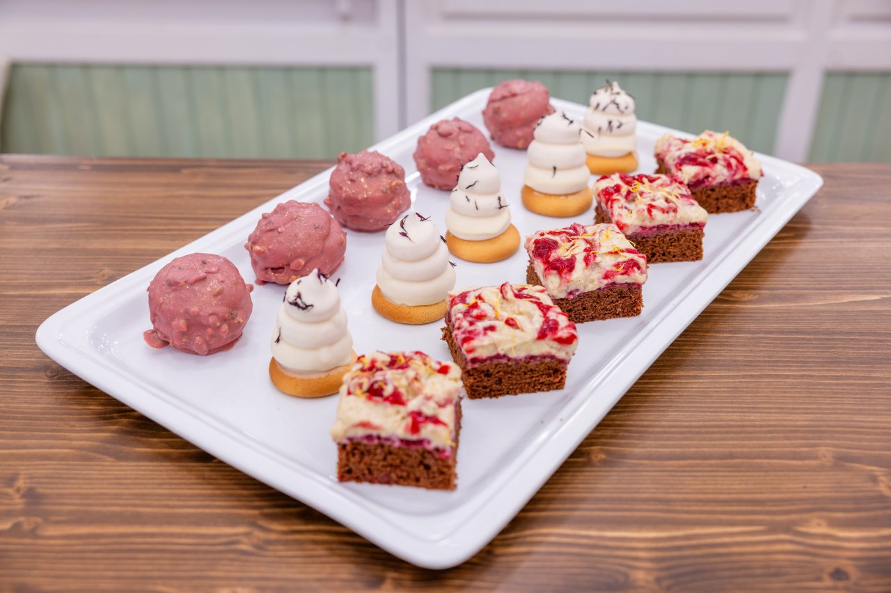 Na vychladlé buflery nastříkáme rybízový sníh, namočíme do bílé čokolády a ozdobíme květy chrpy.