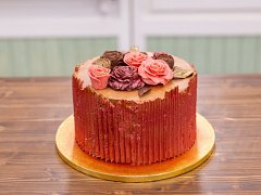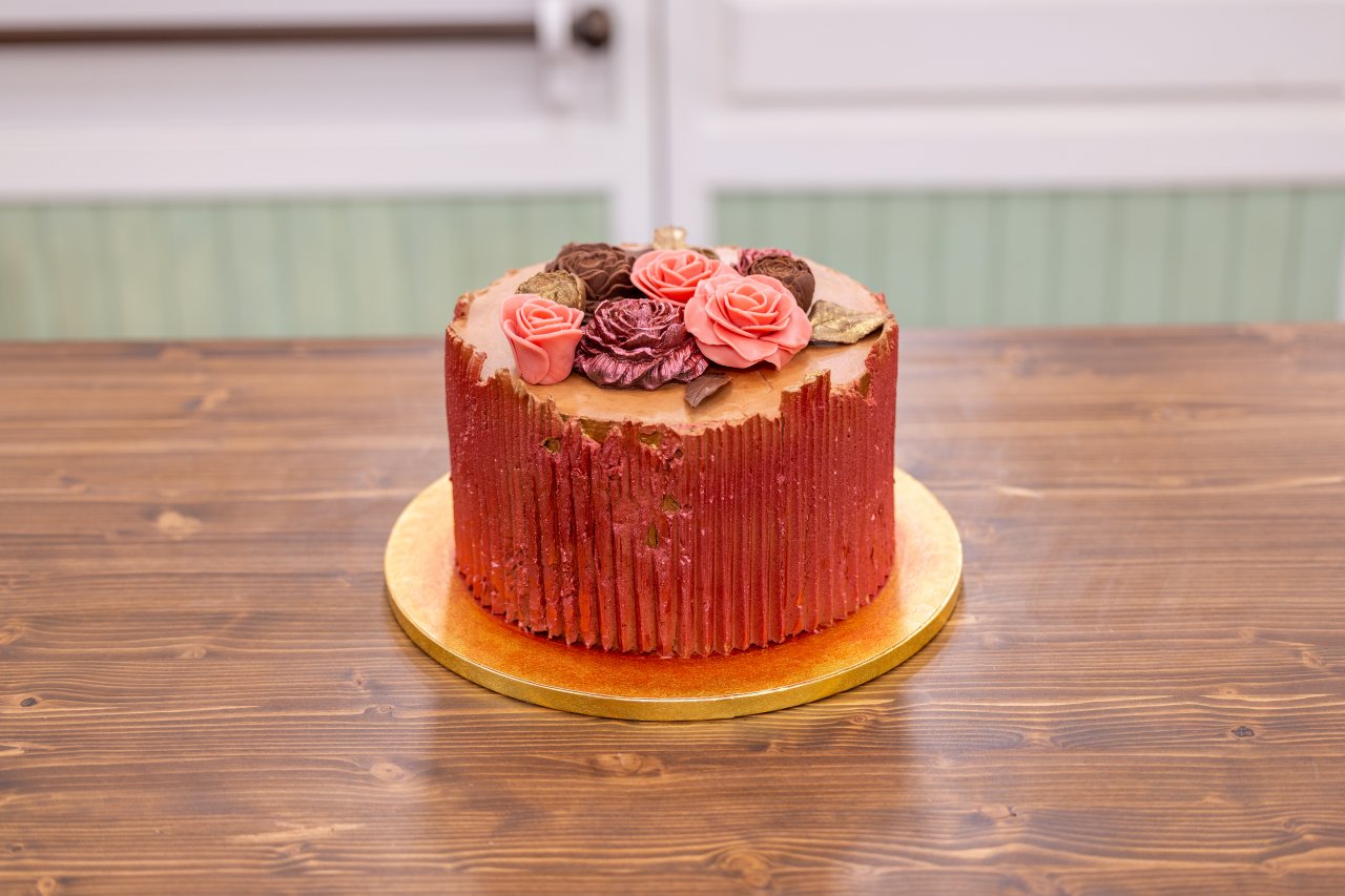 Vychlazený dort obmažeme ganáží shora i po bocích a vytvoříme strukturu stěrkou. Nakonec ozdobíme krémem pomocí řezané špičky a temperovanými čokoládovými střepy.
