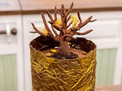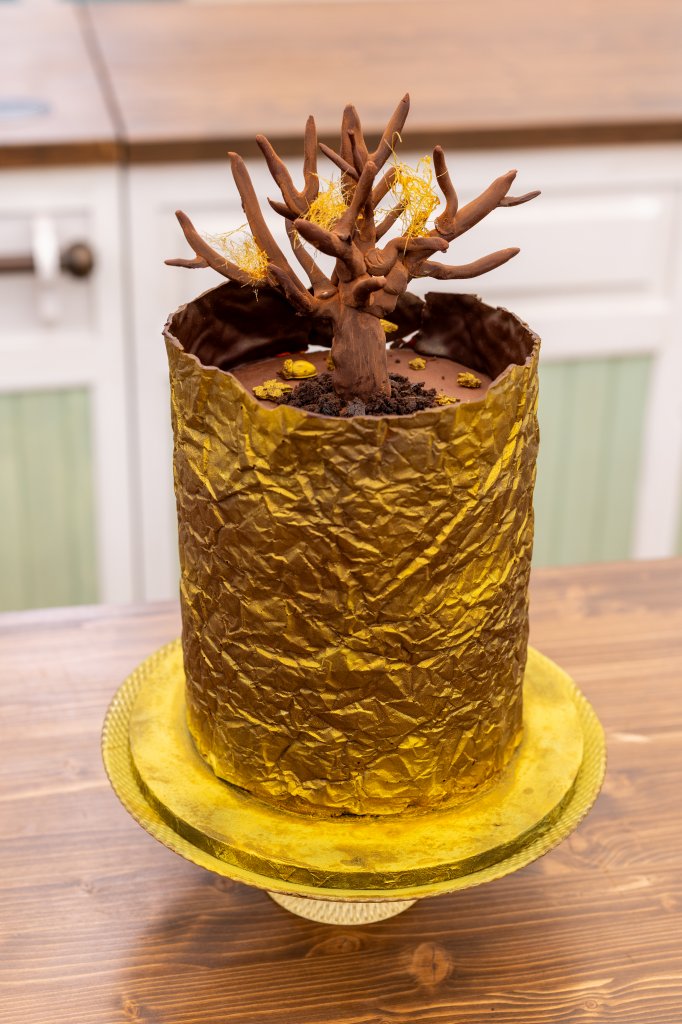 Drát ve tvaru stromu obalíme modelovací čokoládou, vytvoříme základnu a přeneseme na dort. Na vrchol umístíme karamelové vlasy.