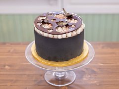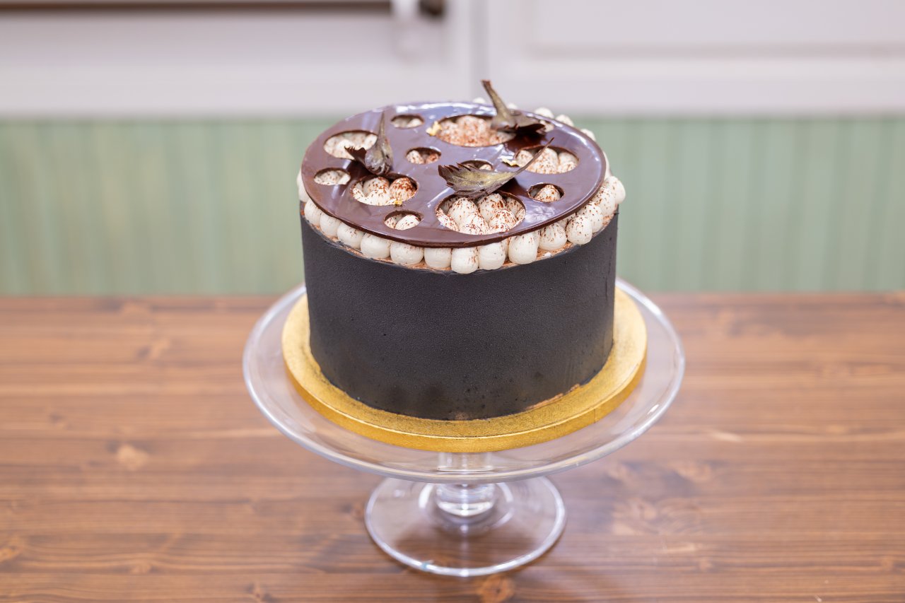 Každý korpus rozřízneme na tři díly a před vrstvením krémů jej bohatě prokapeme sirupem. Do první vrstvy každého korpusu naneseme křupavou vrstvu, poté vrstvíme čokoládový krém, čokoládovou šlehanou ganáž, čokoládové crémeux a likérové crémeux. Stejným způsobem sestavíme i druhý korpus. Necháme ztuhnout, poté celý dort obmažeme krémem, zamrazíme a aplikujeme velvet sprej. Nakonec dozdobíme vanilkovou šlehanou ganáží a čokoládovými dekoracemi.