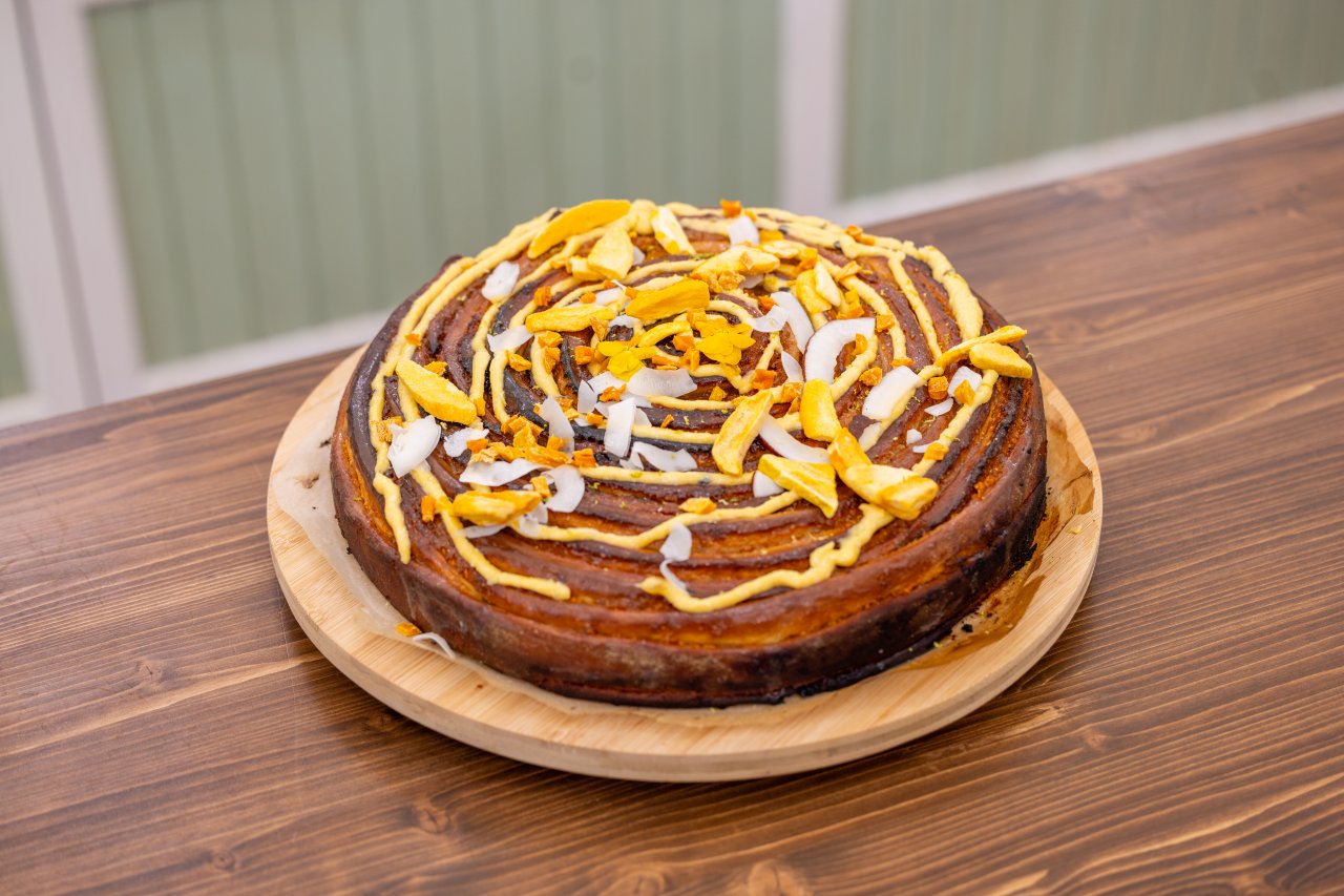 Rozválený plát potřeme mangovou náplní. Nakrájíme na dlouhé pruhy široké přibližně 3 cm. Pruhy postupně motáme do tvaru velkého šneka.