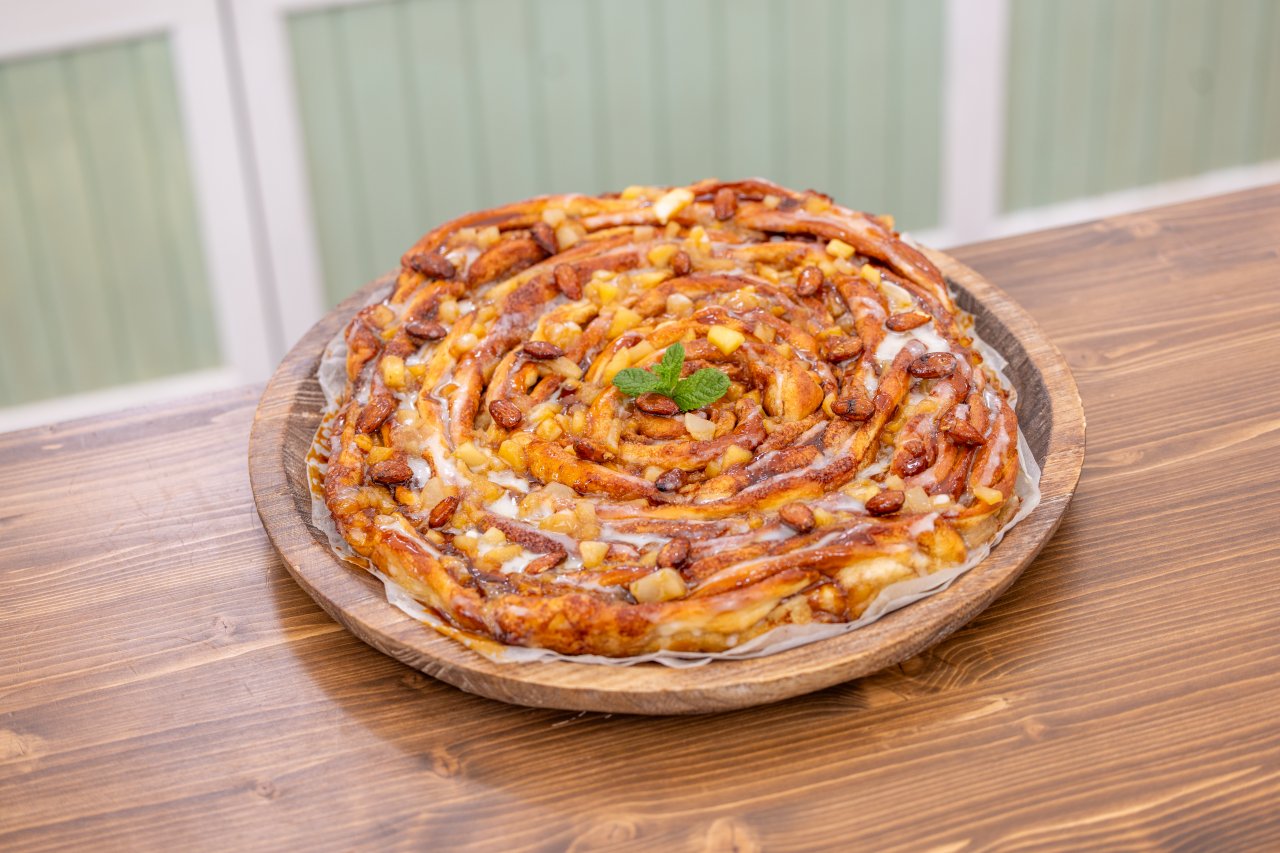 Vykynuté těsto rozválíme na obdélník přibližně 50 × 20 cm. Na plát rozetřeme náplň z másla, cukru a skořice, poté rovnoměrně rozetřeme compoté. Obdélník rozdělíme na několik stejně širokých pruhů. Jeden pruh pevně srolujeme a vložíme do kulaté formy o průměru 30 cm. Na něj postupně namotáváme další pruhy, aby vznikl jeden velký šnek. Necháme znovu vykynout a pečeme při 170 °C přibližně 25–30 minut. V průběhu pečení několikrát prokapeme rozpuštěným máslem.