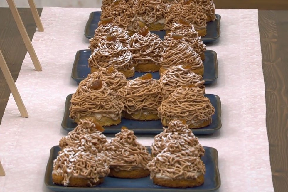 Kaštanové pyré, kaštanovou pastu, změklé máslo a rum utřeme do hladkého krému. Směs přendáme do cukrářského sáčku se speciální špičkou na „nudle“ a rovnoměrně nastříkáme na zamražený základ tak, aby vznikl typický tvar Mont Blanc.