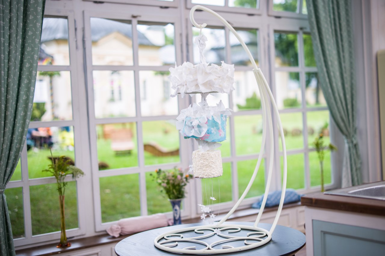 Z jedlého papíru vystřihneme tvary, lehce je navlhčíme vodou, vytvarujeme a přilepíme jedlým lepidlem. Vytvoříme květy, dozdobíme prachovými třpytkami a upevníme na drátky zapíchnuté do dortu.