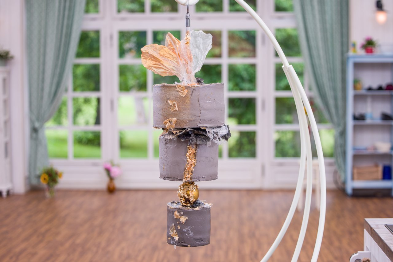 Obmažeme ruským máslovým krémem, znovu necháme zatuhnout a finálně dekorujeme podle konceptu „Erupce na slunci“.