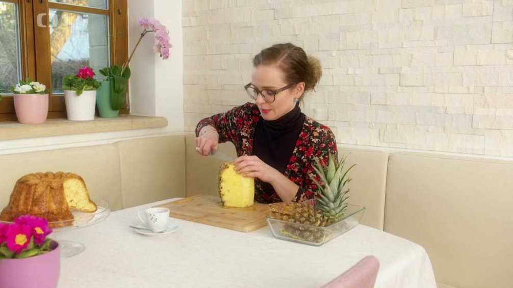 Z ananasu můžete tvořit kolečka nebo třeba kostičky. My máme v oblibě osminový řez. Ten uděláte tak, že ananas nahoře a dole odříznete a následně ořežete i slupku po stranách. Snažte se nožem nezasahovat příliš do dužiny, aby vám jí zbylo co nejvíce. Nyní si postavte ananas na výšku a nařízněte z vrchu na polovinu, čtvrtiny a pak i osminy. Půjde vám to lépe, pokud ananas naříznete vždy jen ze 4/5 a tím bude stále pěkně držet pohromadě. Pak to jednoduše doříznete a je to. Máte nyní 8 dlouhých stroužků ananasu. Jejich tvrdý vršek (střed ananasu) odřízněte také. Byl by tvrdý na skus a postrádá sladkost.