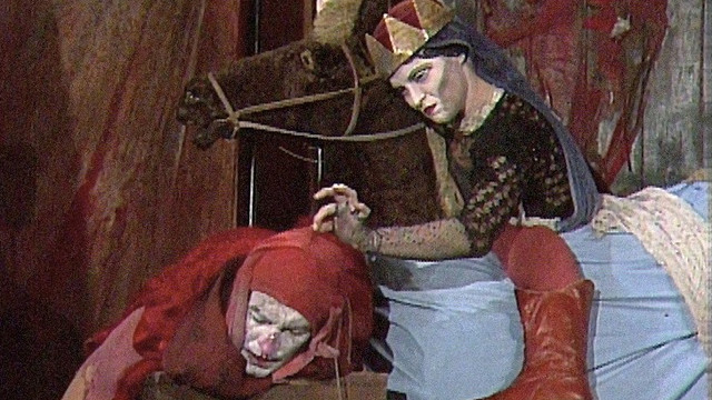 Boleslav Polívka a Chantal Poullain v legendární inscenaci Divadla na provázku, zaznamenané v Branickém divadle pantomimy v Praze.