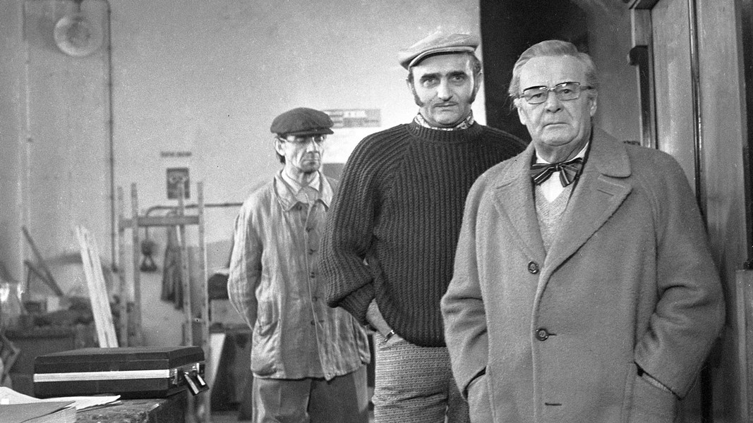 J. Somr, B. Záhorský a B. Waleská v televizní adaptaci povídky Norberta Frýda o příliš dokonalém podvodu.
