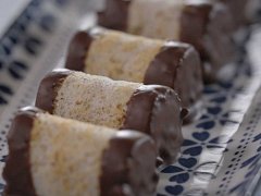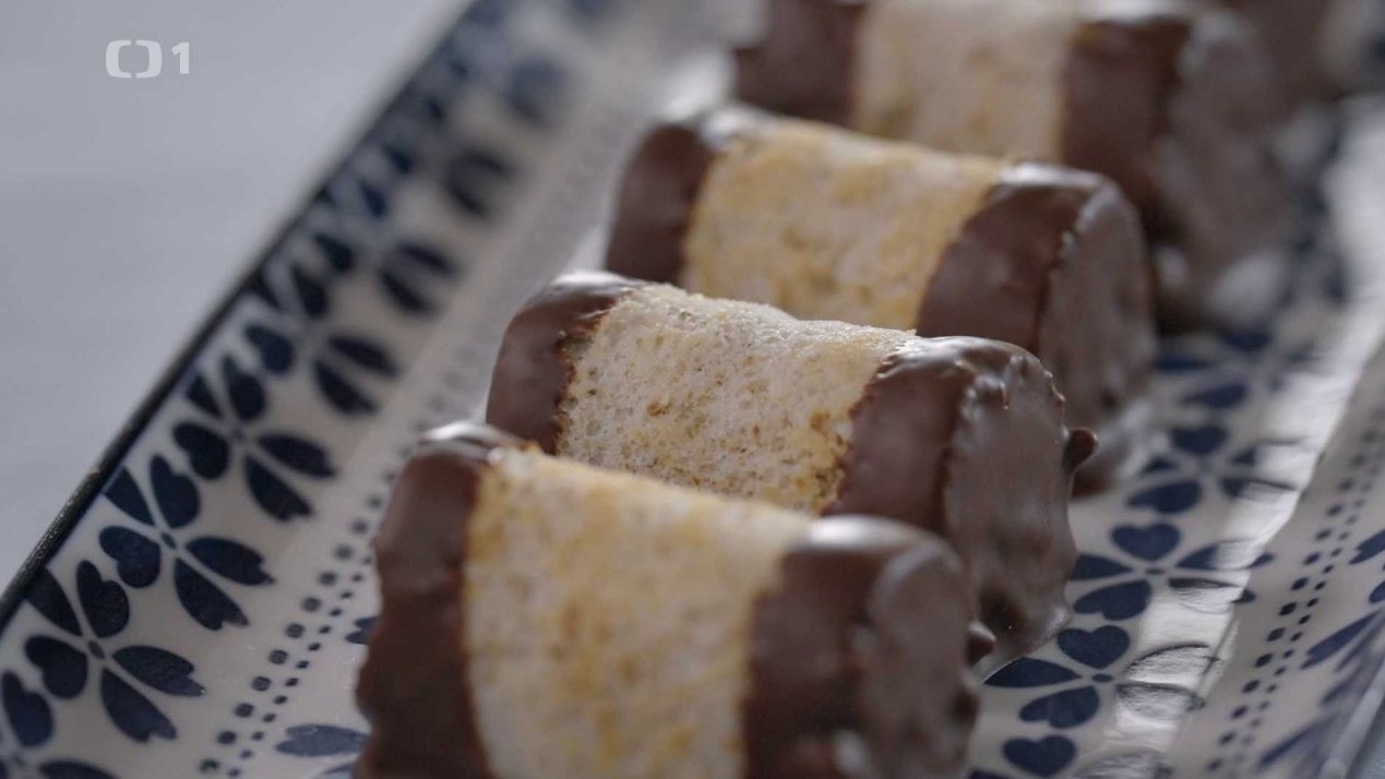 Z vychladlého plátu sloupneme pečící papír a otočíme plát. Na plát rozetřeme krém a rozkrojíme podélně na 3 díly, díly smotáme na tenké ruličky a necháme vychladit v lednici. Smotané štafetky nakrájíme dle svých požadavků na špalíčky. Ve vodní lázni rozpustíme čokoládu se ztuženým pokrmovým tukem. V čokoládě namáčíme oba kraje štafetek a vracíme je na pečící papír. Po zatuhnutí čokolády máme hotové rolované štafetky.