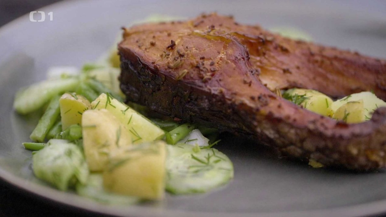 Brambory nakrájíme i se slupkou na větší kostičky, šalotku na menší kostičky, oloupanou okurku na tenké plátky. Asi hrst zelených fazolek necháme chvíli přejít párou a zchladlé pokrájíme. Přidáme nakrájený kopr, zalijeme olivovým olejem, osolíme, opepříme a zakápneme limetkovou šťávou. Necháme odležet v lednici.