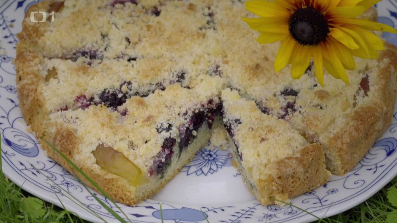 Kulatou formu vyložíme pečícím papírem. Zpracujeme pevnější těsto, které rukama vtlačíme do formy a necháme vyšší okraje. Poklademe ovocem a zasypeme drobenkou. Pečeme na 180°C asi 35-40 min, dle trouby do zlatova.