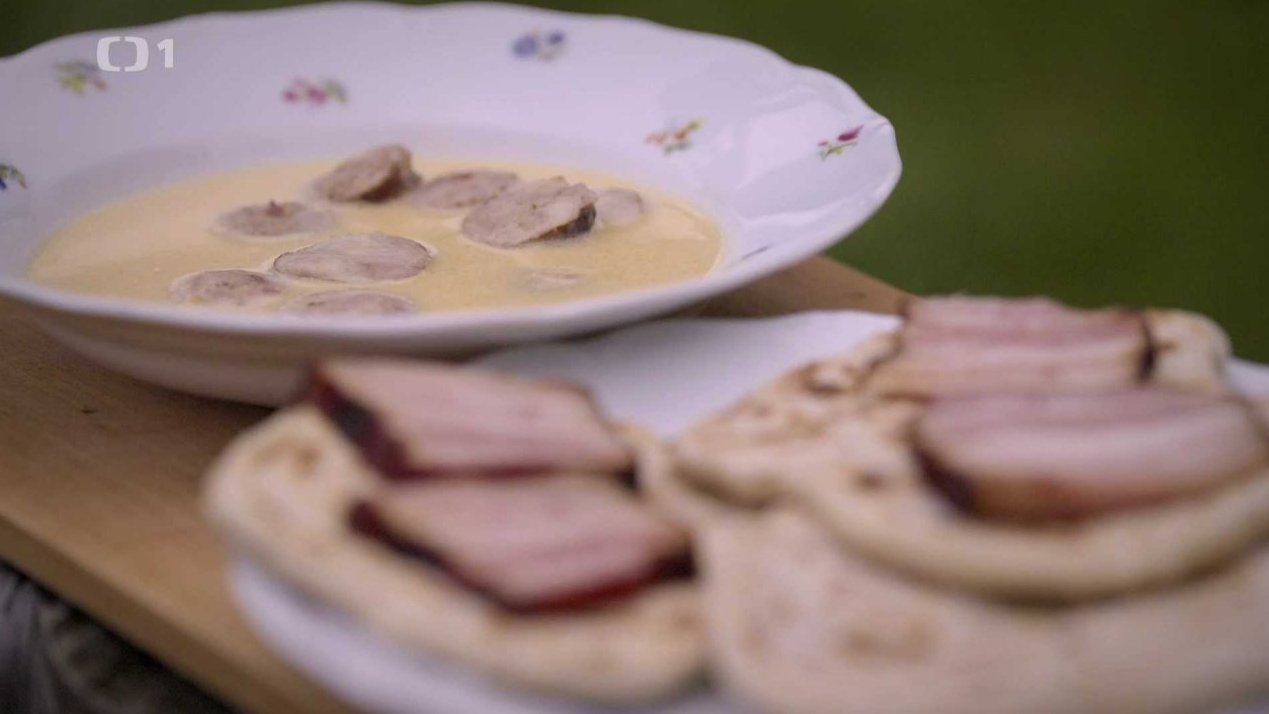 Klobásky nakrájíme na kolečka a uvaříme ve vodě. Mezitím si připravíme jíšku - na sádle upražíme mouku do růžova, zalijeme studenou vodou a povaříme. Až bude jíška hotová, přilijeme do ní postupně uvařené klobásky s vodou a necháme vařit. Nakonec přidáme smetanu. Dosolíme podle chuti.