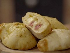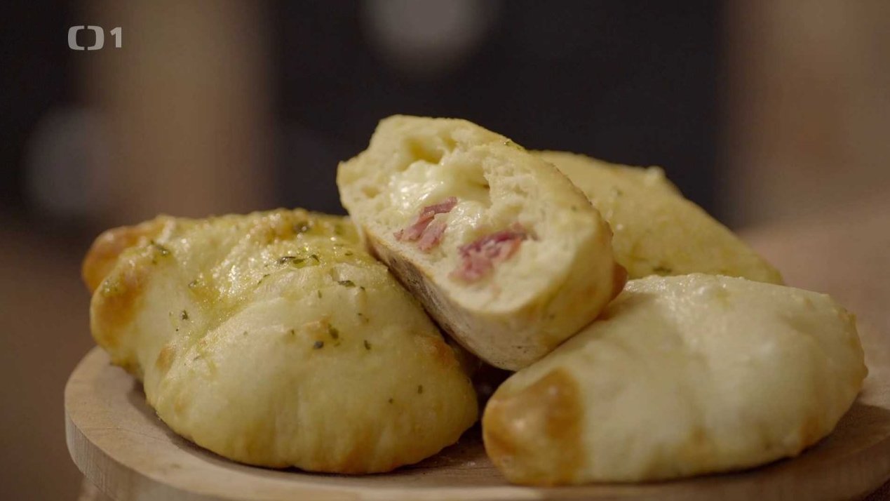Druhou polovinu těsta také rozdělíme na části, bochánky roztáhneme do placky a plníme krájenou slaninou, sýrem, pršutem a zabalíme do buchty. Necháme také odpočinout. Po upečení potřít oliv .olejem.