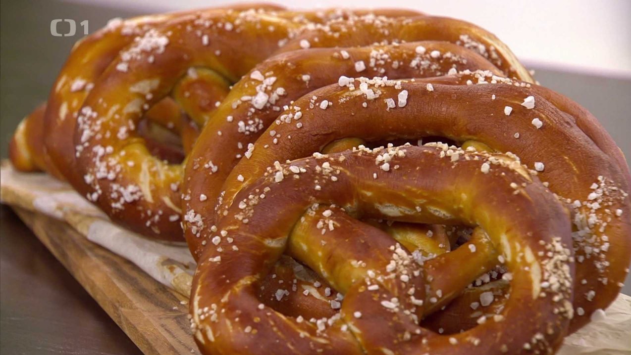 Rozdělíme na kousky po 80g a rozválíme na dlouhé prameny. Stočíme do tvaru preclíků a uložíme na plech. Dáme na jednu hodinu odpočinout do lednice. Připravíme si lázeň smícháním hydroxidu a vody, jednotlivé Odpočaté preclíky v ni dobře namočíme (použijeme rukavice) a uložime na plech, posypeme solí a ihned pečeme při 190c asi 10 minut dozlatova.