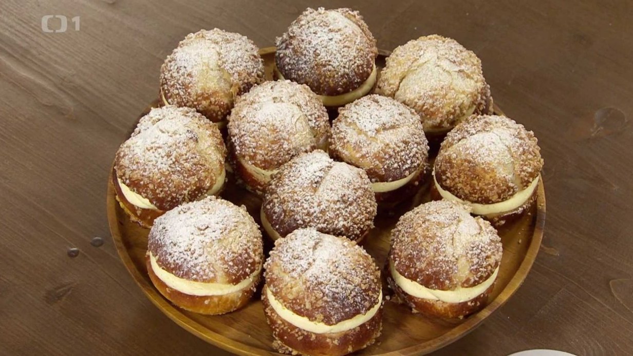 Na těsto dáme do mísy všechny ingredience kromě soli a sádla a 5 min. hněteme. Přidáme sůl, sádlo a hněteme, dokud nezískáme pevné a pružné těsto. Dáme ho v pokojové teplotě dobře přikryté nakynout do dvojnásobného objemu. Poté s těsta vytvoříme 20 stejných kuliček, necháme je na kynout na plechu s papírem na pečení do dvojnásobné objemu, potřeme vejcem, Ozdobíme drobenkou, kterou jsme připravili ze všech ingrediencií a pečeme při 190°C asi 10 až 12 min. dozlatova.