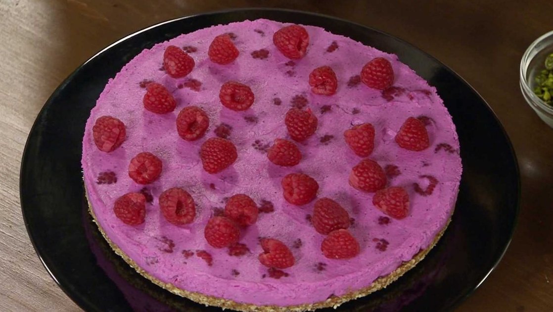 Kešu ořechy dáme namočit do studené vody přes noc, nebo je 15 min. vaříme. Scedíme a necháme vychladnout. Do kuchyňského mixéru dáme všechny ingredience kromě malin, agaru a vody, rozmixujeme dohladka. Agar a vodou přivedeme k varu a vaříme 1 min. Tuto směs přidáme k rozmixované kešu hmotě a krátce promixujeme. Stěrkou do ní vmícháme maliny a hned nalejeme na předem připravený základ. Dáme do lednice na několik hodin ztuhnout. Před podáváním povrch ozdobíme čerstvým ovocem, mrazem sušeným ovocem a také pistáciemi.