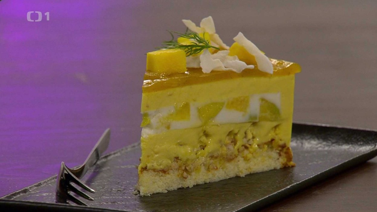 Dortovou formu o průměru 24 cm vyložíme papírem na pečení. Na boky formy dáme plastovou fólii nebo pečicí papír. Na dno dáme korpus, na něj dáme v čokoládě obalenou křupavou drobenku, polovinu pěny, zamražený kokosovo mangový disk a zbylou pěnu. Dort necháme uzrát nejlépe přes noc v lednici. Poté ho opatrně vyjmeme z formy, Dáme na podnos a ozdobíme diskem z želé dekorace. Dokončíme kousky Manga a kokosu a zelených výhonků.