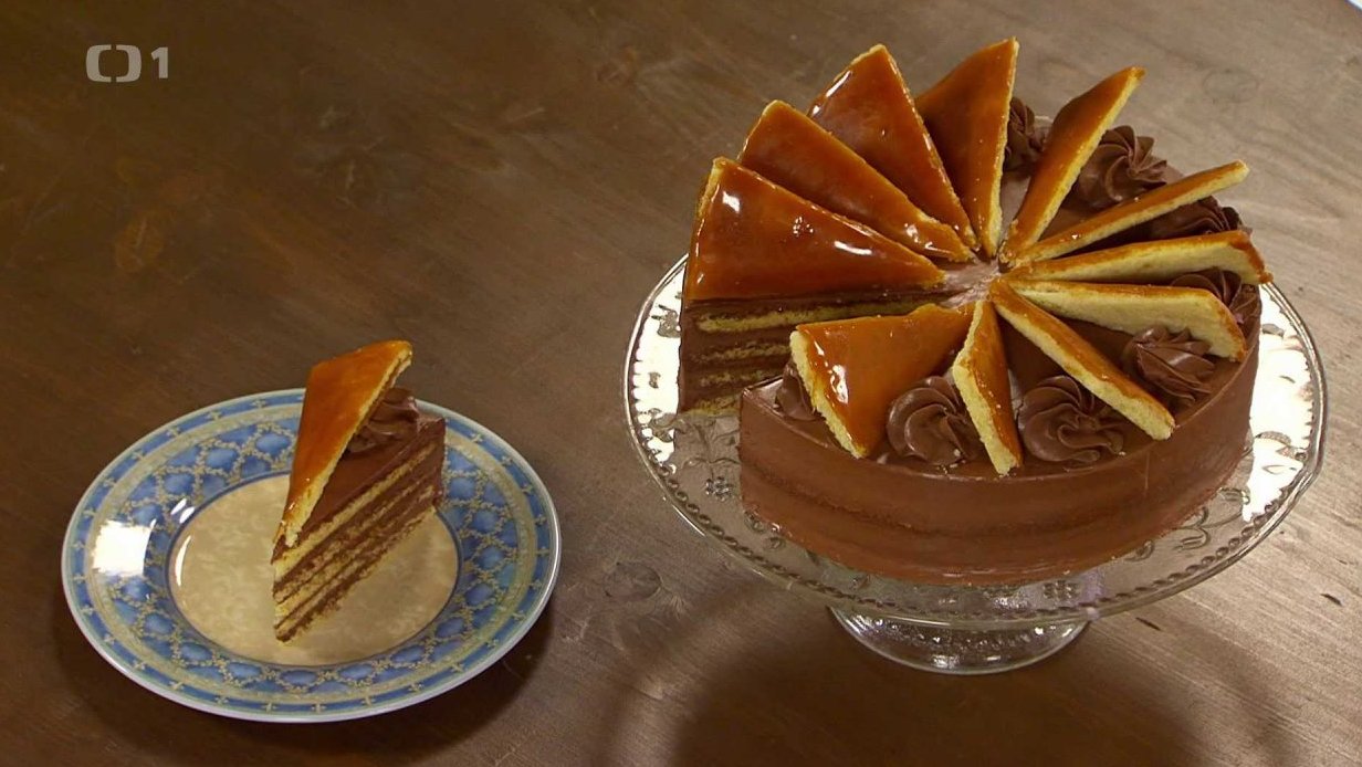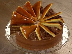 Z cukru si utavíme světlý karamel, přidáme máslo a umícháme dohladka. Ještě horký nalejeme na poslední placku a karamel po celém povrchu rozetřeme. Ještě před ztuhnutím ho pomoci olejem namazaného nože rozdělíme na 12 dílů a ty po úplném vychladnutí naskládáme na povrch dortu, na předem připravené pusinky do tvaru větrníku.