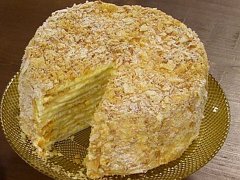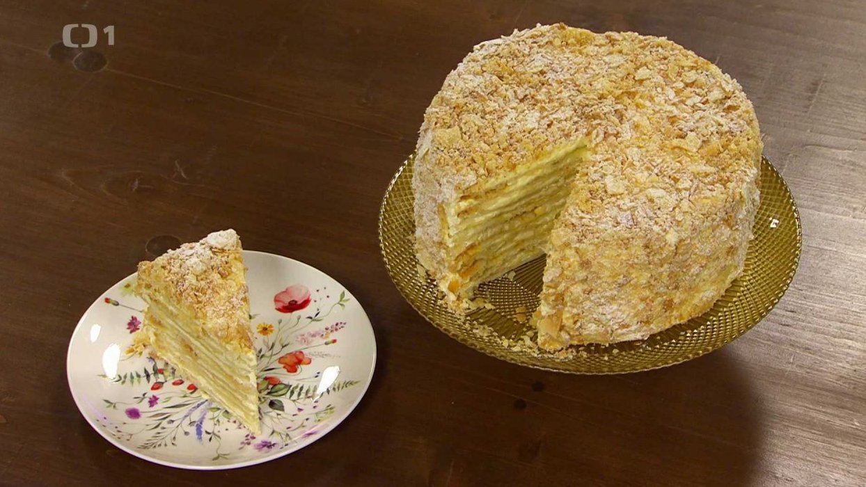 Zakryté necháme v lednici 2 hodiny odpočinout. Těsto rozdělíme na 10 dílů a na pomoučené ploše vyválíme do průměru 26 cm. Jednotlivé placky pečeme zvlášť při 200°C dozlatova. Po upečení formou vykrojíme kola o průměru 24cm. Drobečky schováme.