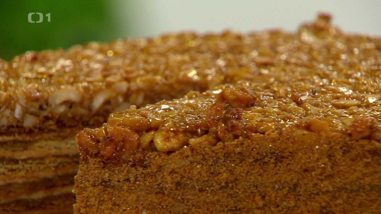 Vejce nahřejeme s cukrem a medem na 45°C, přidáme máslo a rozmícháme. Poté zamícháme všechny ostatní ingredience. Těsto rozdělíme na 8 stejných dílů a necháme ho 30 minut odpočinout. Poté každý díl rozválíme na kruh o průměru 26 cm a každý zvlášť pečeme při 180°C asi 8 - 10 minut. Po upečení je seřízneme ráfkem tak, aby všechny byly stejně veliké. Odřezky po vychladnutí pomeleme. Poslední, osmý díl pečeme ve formě spolu s krokantem, který připravíme svařením všech ingrediencí a natřením na povrch osmého dílu.