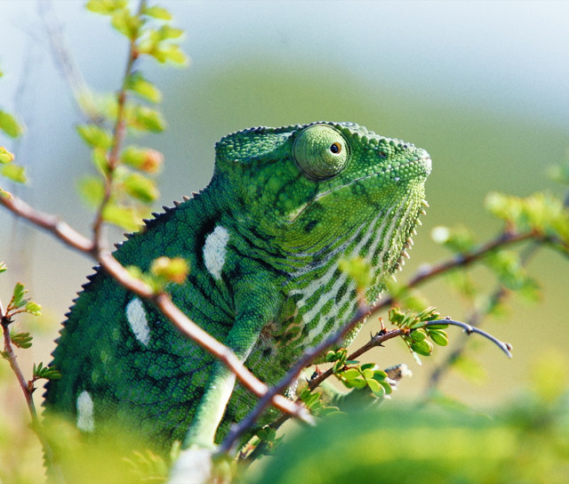 Chameleoni, mistři barevných převleků a tanečních kreací - stvořeni pro karneval! V repertoáru ale mají i další triky a čísla, kterými třeba lákají partnery nebo zastraší či obelstí nepřátele. Na ostrově Madagaskar je těžké se s nimi nesetkat, protože právě tady žije skoro padesát procent jejich známých druhů. Třeba chameleon pardálí, nejpestřeji vybarvený druh planety, má přibližně dvacet barevných variant, měnících se oblast od oblasti. Nejobávanější je zase chameleon obrovský. Měří na délku sedmdesát centimetrů a je nejmohutnějším a nejhrozivějším zástupcem rodu Furcifer. Zvláštní je i chameleon nosatý s legrační „trumpetkou“ nebo druh Calumma gallus s červeným klaunským nosem. Chameleoni jsou obdařeni mimořádně důmyslnými nástroji, které jim pomáhaly a pomáhají přežít. Jedná se především o jazyk. Ten umějí vystřelit tak rychle a přesně, že kořist nemá sebemenší šanci. Celý zásah trvá zlomek sekundy. A pak je tu ještě ocas – chápavý, mohutně osvalený. Chameleoni jej používají jako pátou končetinu. Přidržují se jím větví, udržují stabilitu, s jeho pomocí skáčou a někdy i šplhají. Ale asi nejvíc je proslavila schopnost měnit barvu. Navzdory všeobecnému přesvědčení jim tento dar, jeden z nejdokonalejších v živočišné říši, neslouží k maskování. K čemu tedy?