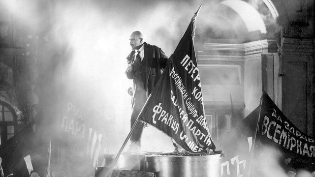 Drama, ohraničené rokem 1917, mapuje události Říjnové revoluce z pohledu bolševiků. – Noha dělníka spočine na carské koruně. V bouřlivé atmosféře se po svržení monarchie ustavuje prozatímní vláda, když v Tavrickém paláci zasedají salónní levičáci. Nic než buržoazie, přisvědčuje Uljanov Lenin, který z pancéřového vozu burcuje davy proti novému zřízení v petrohradských ulicích. Měšťáctvo si vyřizuje účty s dělníky a propukají boje. Město vře neklidem. Kontrarevoluce je poražena, ale revoluční proletariát ještě neodložil své zbraně. Lenin na veřejném zasedání vyhlašuje ozbrojené povstání, načež rudé gardy společně s dělnictvem a námořníky obkličují Zimní palác, kde v malachitových síních schůzuje zoufalá vláda. Bolševické předsednictvo hlásá moc, mír a půdu. Odpovědí je mu z palácového náměstí střelba. Napětí se stupňuje. Ministři neodpovídají na bolševické ultimátum. Z křižníku Aurora vyšlehnou výstřely – signál pro útok rudé masy, která nakonec proráží obranu paláce. Vláda je zatčena. Lenin na tribuně vítězství zvěstuje: „Dělnická a rolnická revoluce se stala skutkem. Ať žije světová revoluce!”