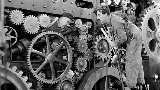 Hrdina příběhu, Tulák Charlie, který pracuje jako dělník u pásové výroby, se následkem stereotypní činnosti jednoho dne pomate na rozumu a ztrácí své místo v továrně. Jako nezaměstnaný se snaží vyrovnat se společenskými problémy a všudypřítomným zmatkem. V jeho souboji „s osudem“ sehraje nemalou roli náhoda, s jejímž přispěním se smolař Tulák objevuje v těch nejchoulostivějších situacích, a také se stává nedobrovolným hrdinou.