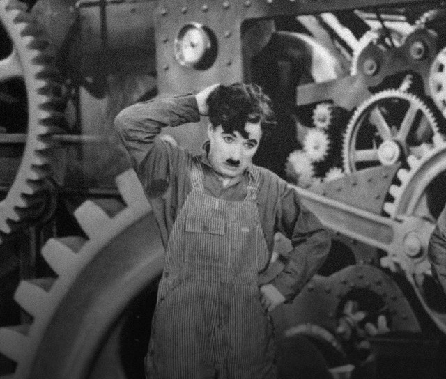 Hrdina příběhu, Tulák Charlie, který pracuje jako dělník u pásové výroby, se následkem stereotypní činnosti jednoho dne pomate na rozumu a ztrácí své místo v továrně. Jako nezaměstnaný se snaží vyrovnat se společenskými problémy a všudypřítomným zmatkem. V jeho souboji „s osudem“ sehraje nemalou roli náhoda, s jejímž přispěním se smolař Tulák objevuje v těch nejchoulostivějších situacích, a také se stává nedobrovolným hrdinou.