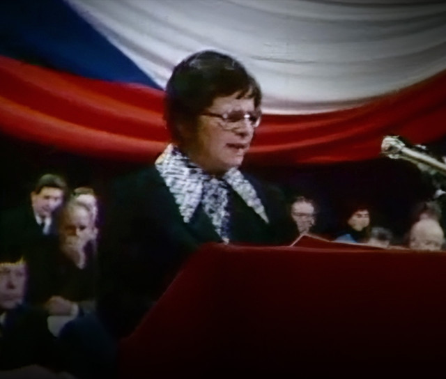 Propagandistický pohled na sjezd umělců a kulturních pracovníků v pražské Lucerně roku 1948, kde se přítomní přihlásili k Vítěznému únoru.