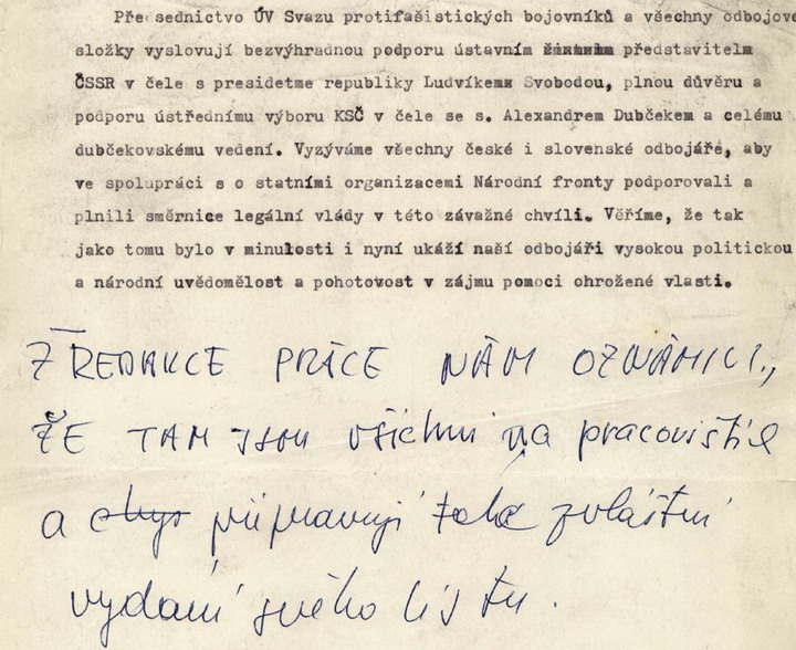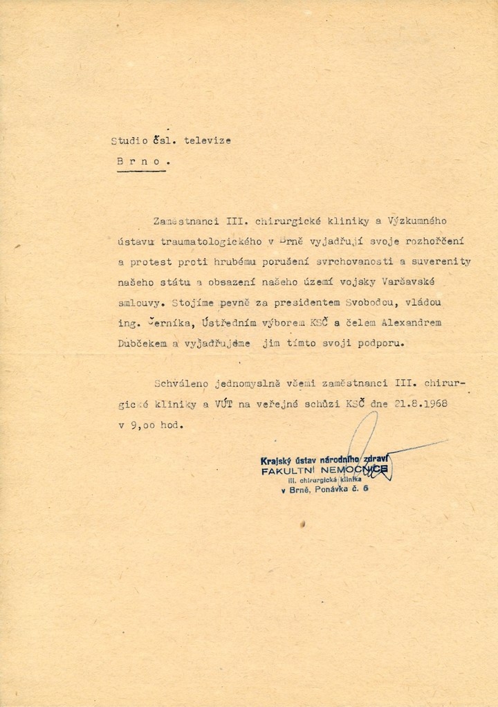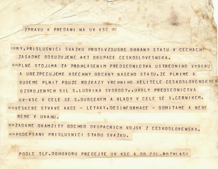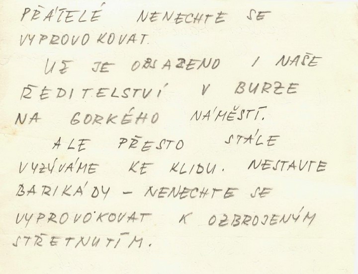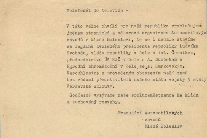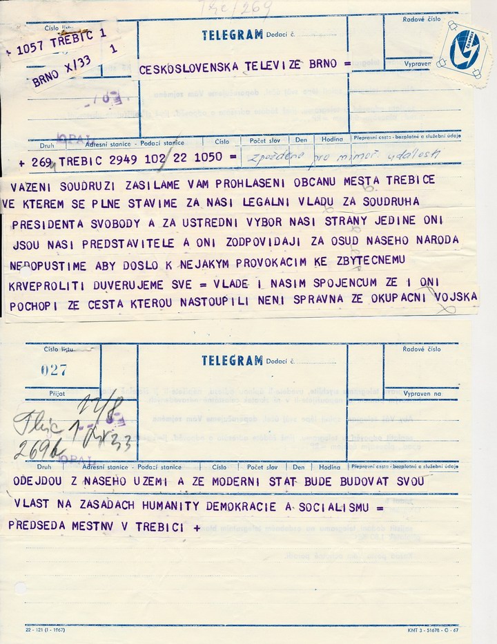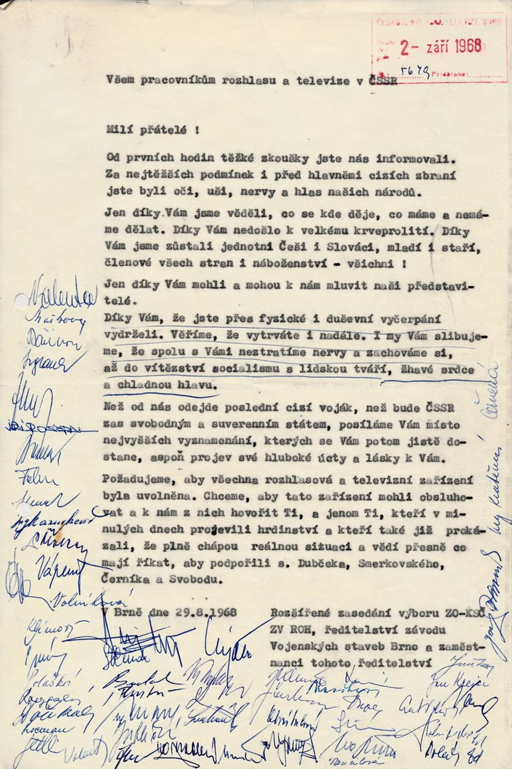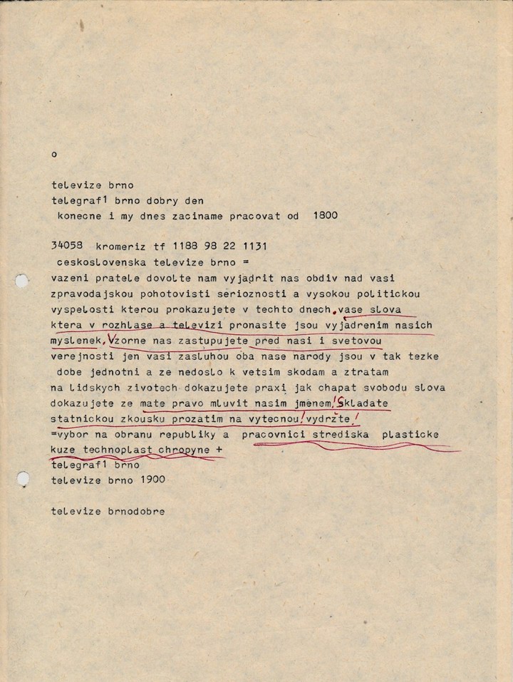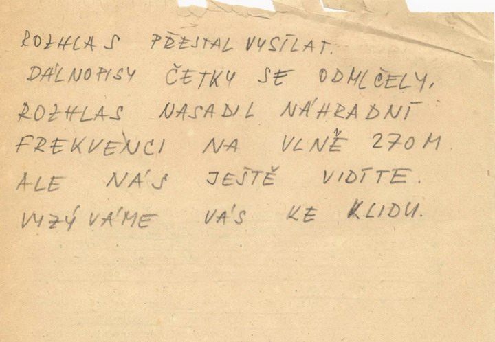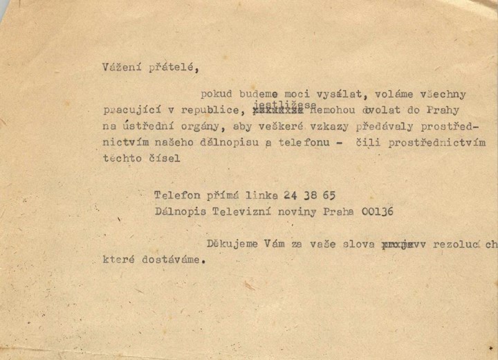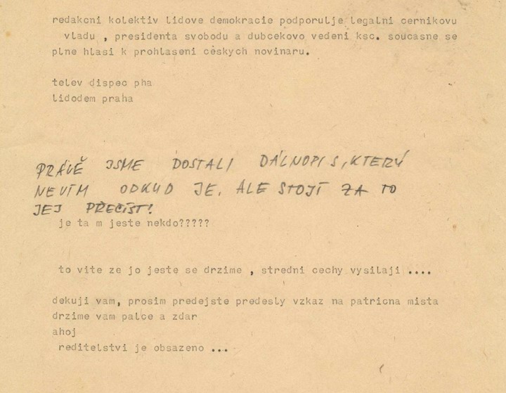 Nově nalezené originální texty z Prahy a Brna, které četli redaktoři Československé televize během improvizovaného vysílání. Obsazení Československa jednotkami vojsk Varšavské smlouvy vyvolalo ve společnosti silný odpor a vztek. Desítky a stovky různých organizací, vojenských posádek a obyčejných lidí posílaly do televize různá provolání a manifesty odsuzující okupaci a vyjadřující jejich vztah k tomuto násilnému činu. Redakce přijaté texty třídila a nosila je rovnou redaktorům před kameru, aby je přečetli. Dochovaly se i děkovné dopisy pracovníkům televize za jejich obětavou a statečnou práci.