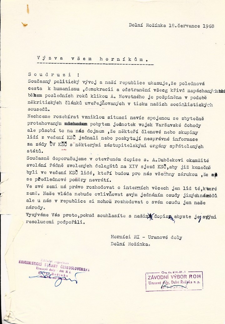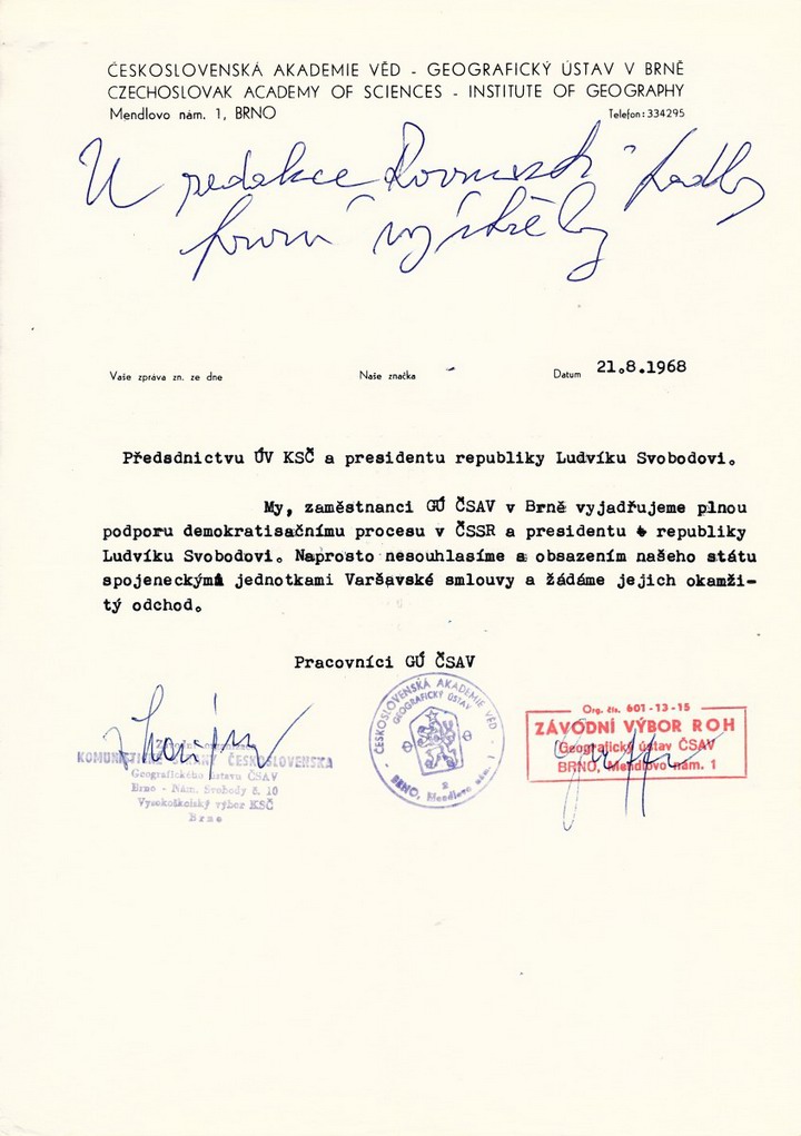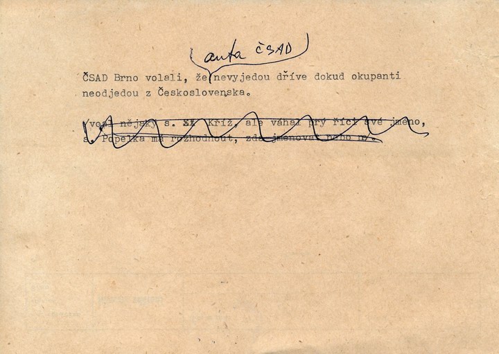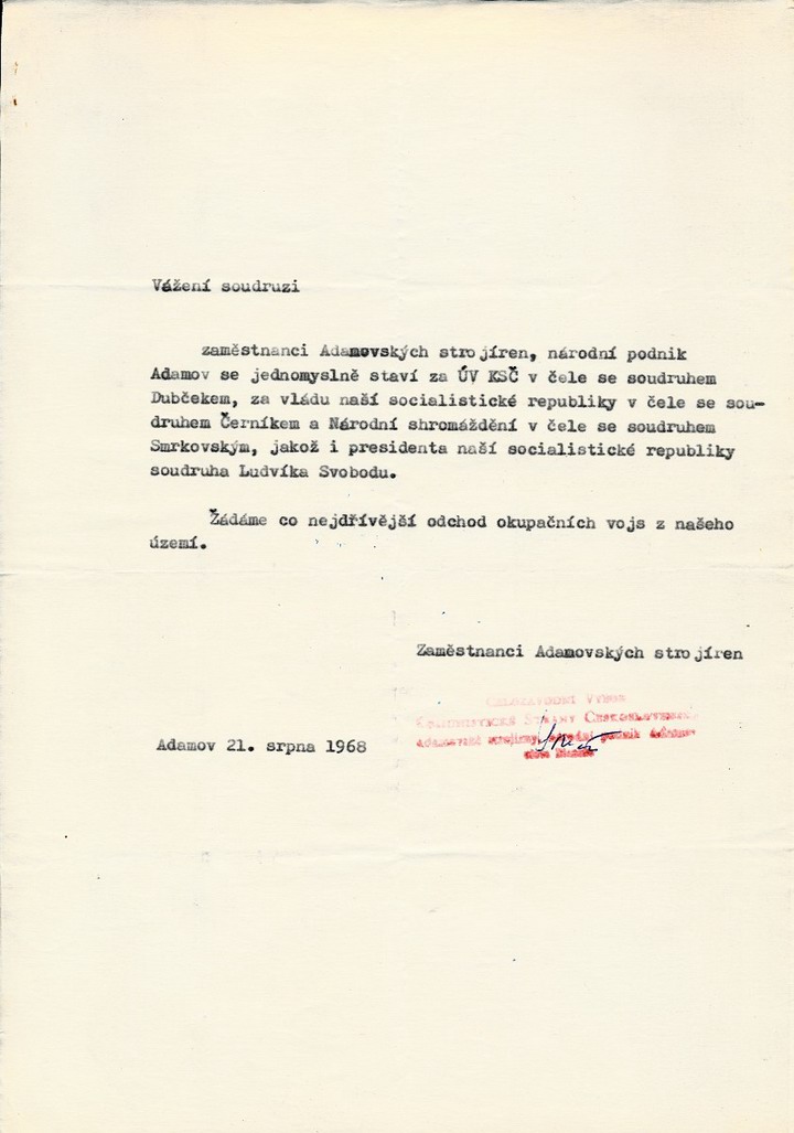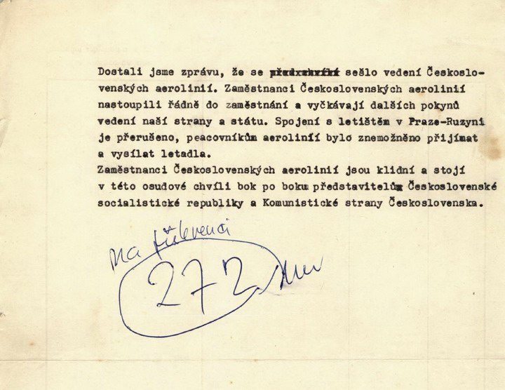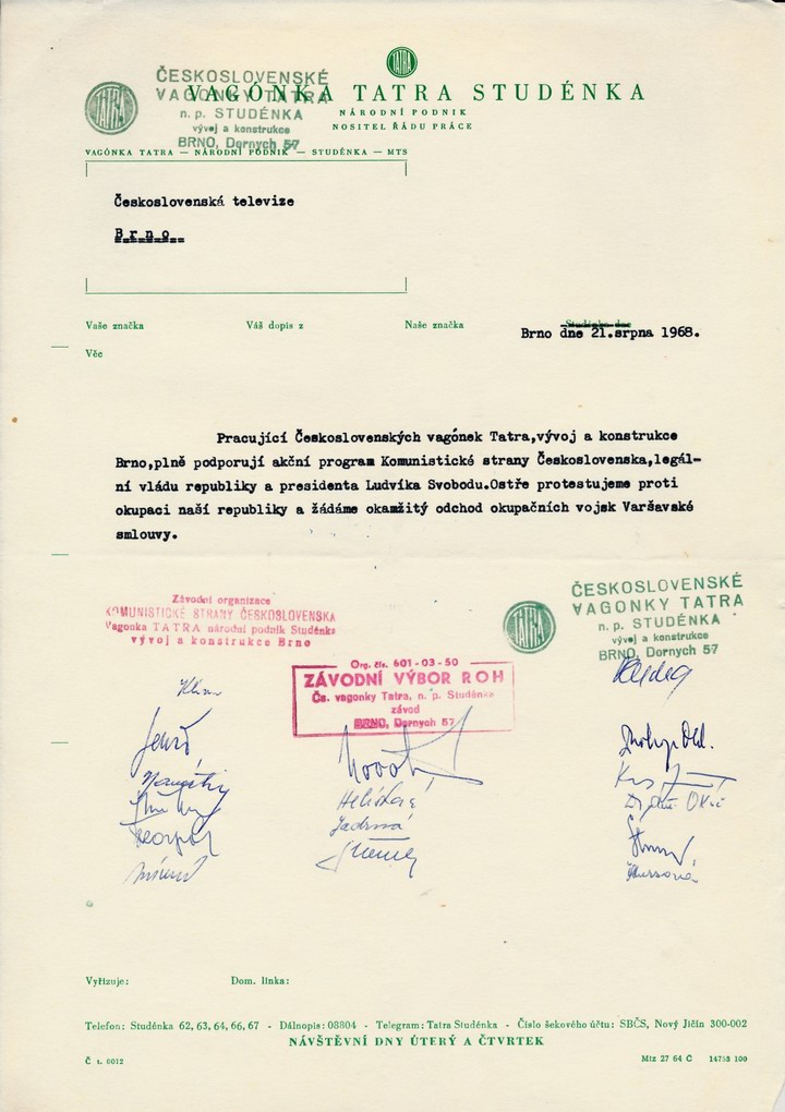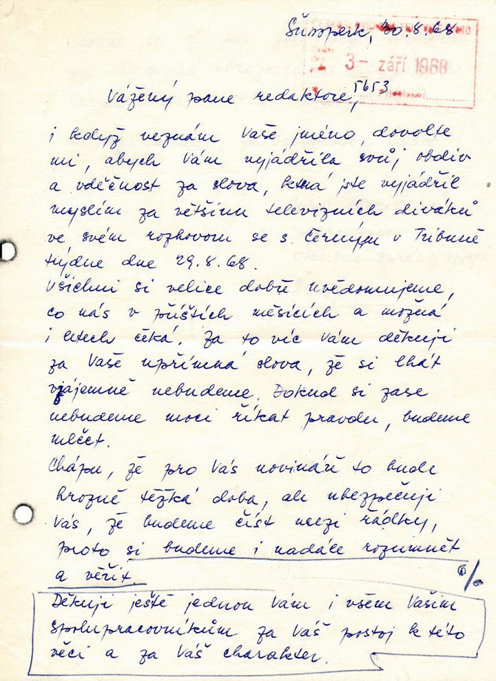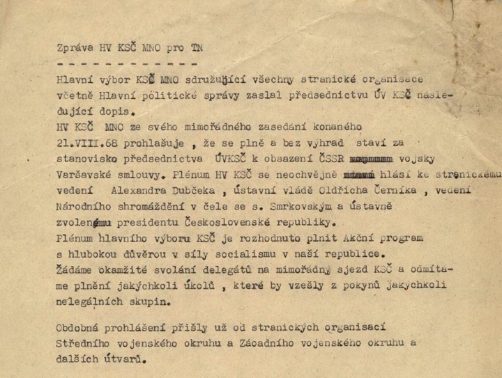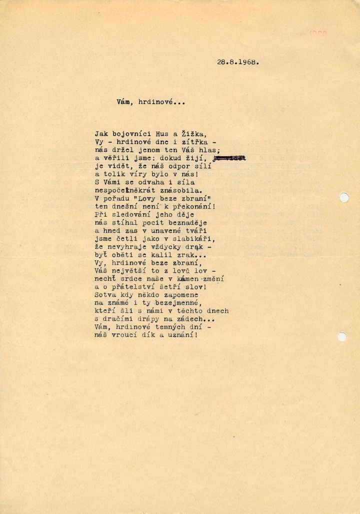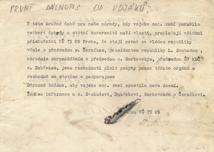 Nově nalezené originální texty z Prahy a Brna, které četli redaktoři Československé televize během improvizovaného vysílání. Obsazení Československa jednotkami vojsk Varšavské smlouvy vyvolalo ve společnosti silný odpor a vztek. Desítky a stovky různých organizací, vojenských posádek a obyčejných lidí posílaly do televize různá provolání a manifesty odsuzující okupaci a vyjadřující jejich vztah k tomuto násilnému činu. Redakce přijaté texty třídila a nosila je rovnou redaktorům před kameru, aby je přečetli. Dochovaly se i děkovné dopisy pracovníkům televize za jejich obětavou a statečnou práci.