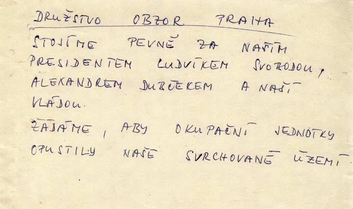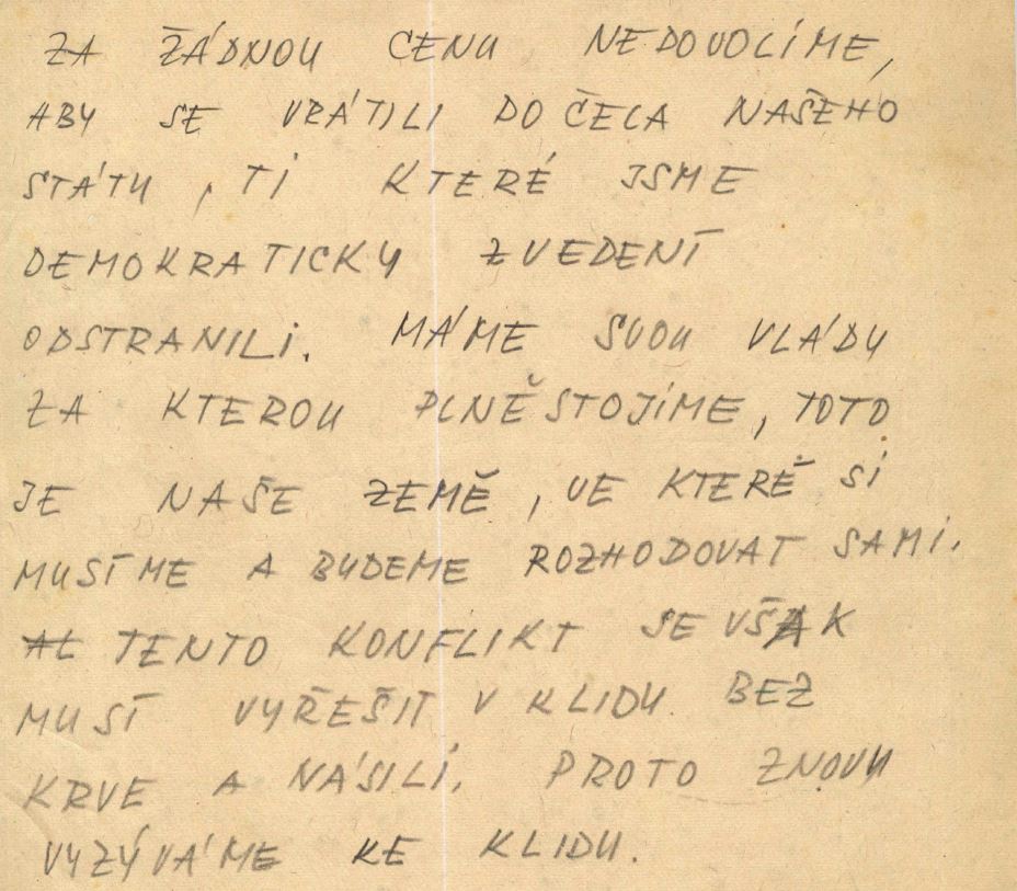 „Zcela jednoznačně trváme na obnovení plné suverenity našeho státu. Její hrubé porušení vážně narušilo základní hodnoty, na nichž bylo budováno naše mezinárodní postavení. Nelze se proto divit, že na různých místech republiky vyhlásili neutralitu naší země. Nemůže být svobodný ten národ, jenž druhému národu svobodu odpírá. Národní a státní orientace Československa ve velkém společenství evropských národů nelze vyjádřit a realizovat prostým požadavkem neutrality. Víme ostatně, že neutralita sama o sobě ještě národní a státní suverenitu nezajišťuje. Mír a klid v Evropě vyžaduje houževnaté úsilí a posílení snahy čelit všemu, co narušuje politickou rovnováhu a provokuje nová ohniska mezinárodního napětí. Víme také dobře, že nezávisí jen na nás, zda budou obnoveny hodnoty a jistoty, které byly pošlapány...“