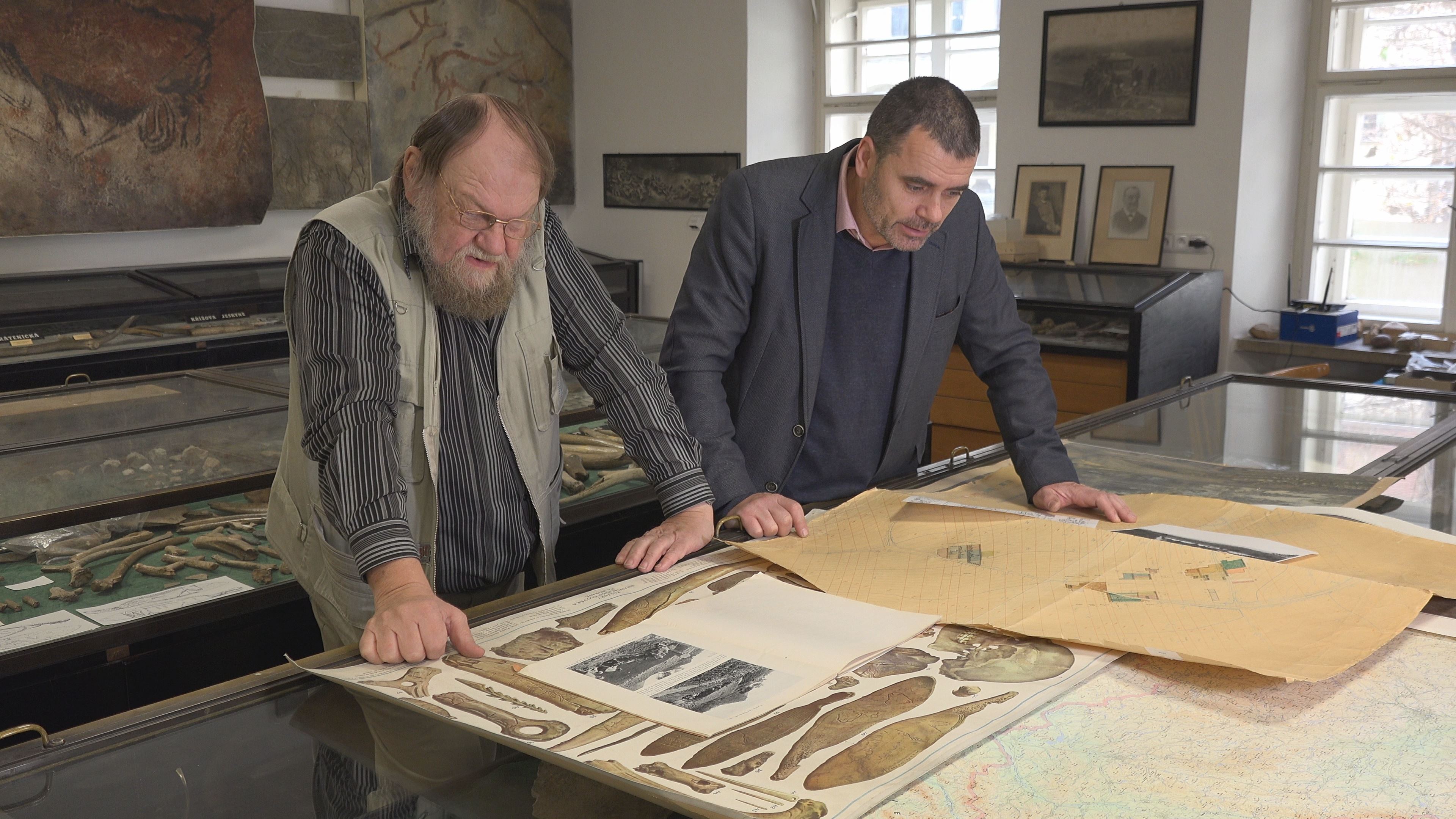 Martin Oliva a Petr Neruda z Moravského zemského muzea nad starými mapami (1037 kB)